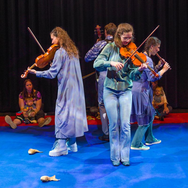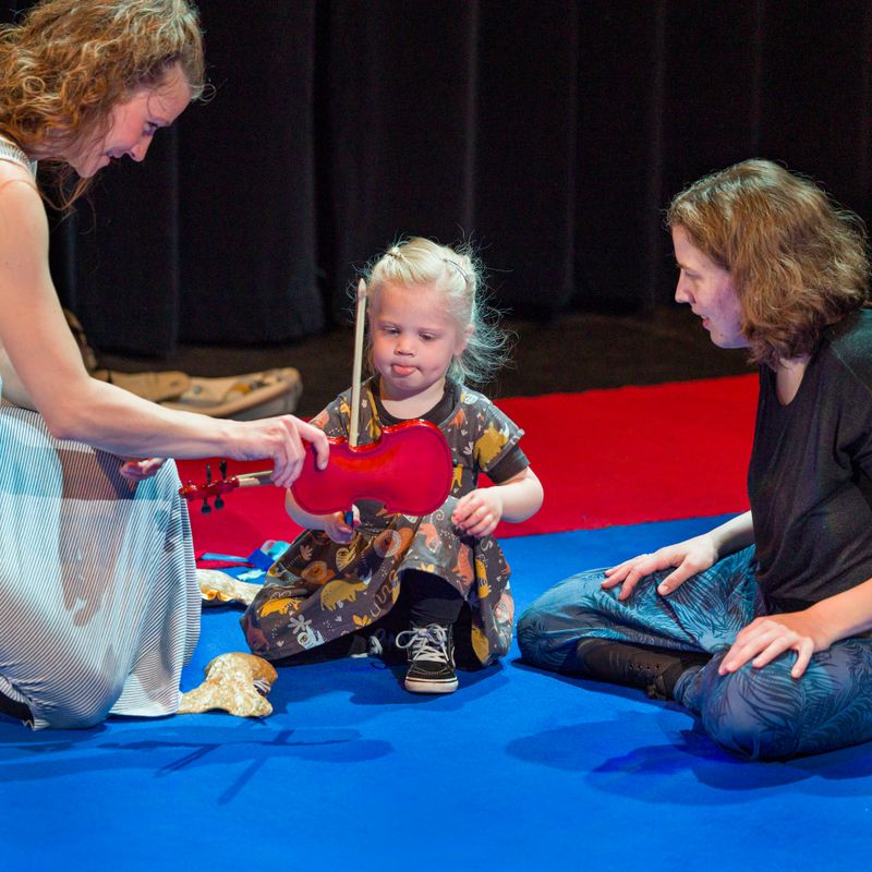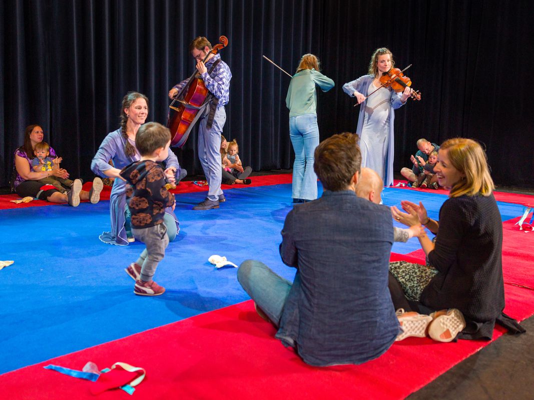 De dreumesen dansen en spelen met het muzikale speelgoed wat ze in hun handen krijgen op het grote kleed mee op beroemde muziek van grote componisten als Mozart, Smetana en Dvořák, dichtbij de muzikanten. Aan het eind van het concert mogen ze zelf echte kleine viooltjes uitproberen. Een concert voor verwonderde oortjes, dansende voetjes en wiebelende kontjes!
