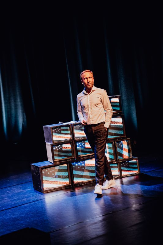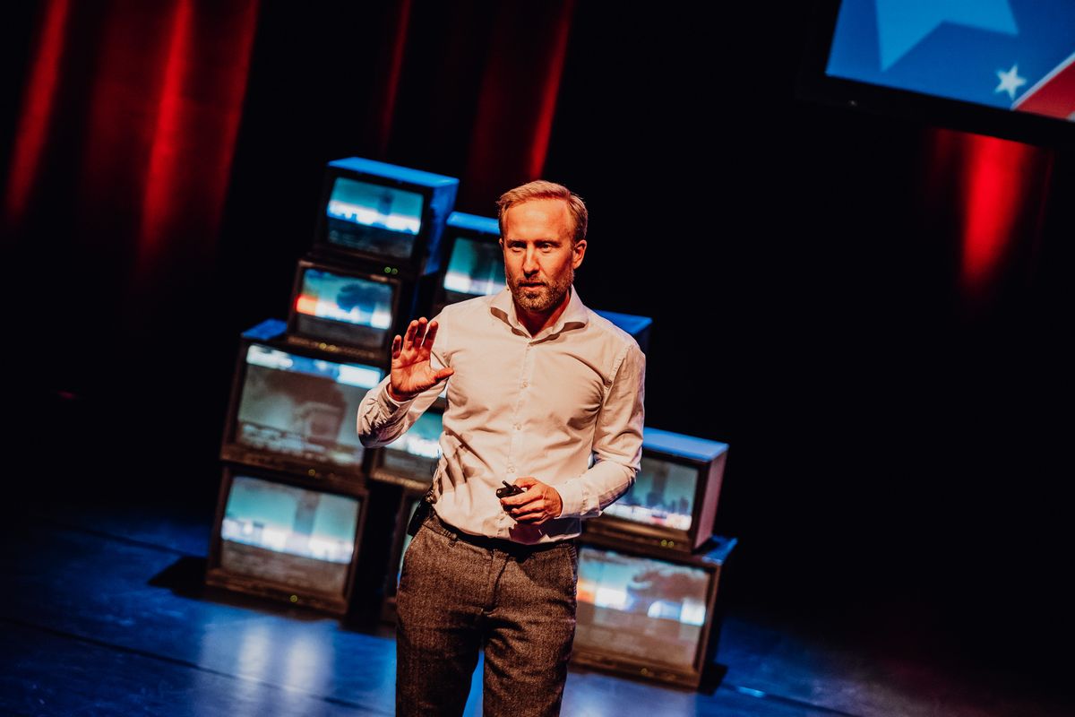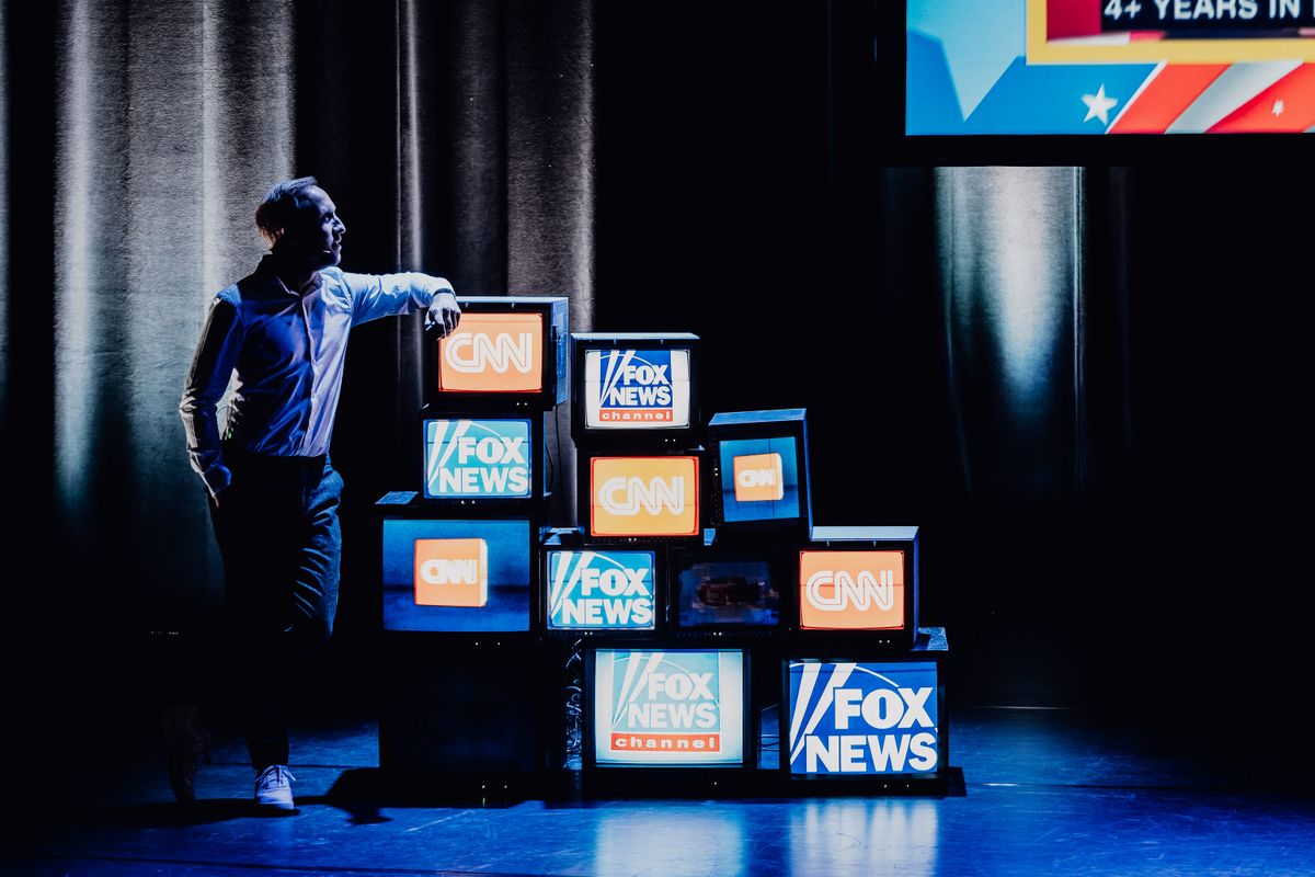 Met herkenbare nieuwsfeiten, scherpe analyses en humoristische videofragmenten laat Raymond zien hoe de media een cruciale rol spelen in de polarisatie van Amerika–en welke signalen daarvan ook in Nederland zichtbaar worden. Tijdens de voorstelling ‘zappen’ we langs de nieuwszenders FOX News en CNN en krijg je een uniek kijkje achter de schermen van Amerika’s mediaoorlog.