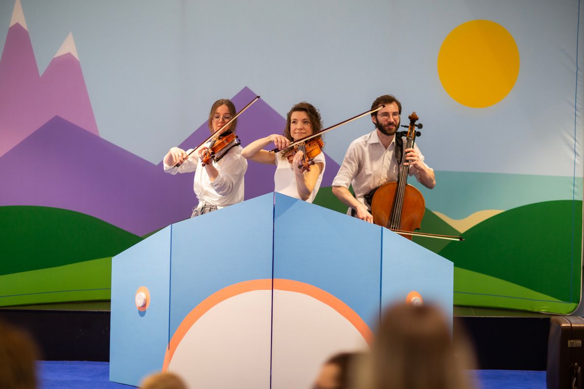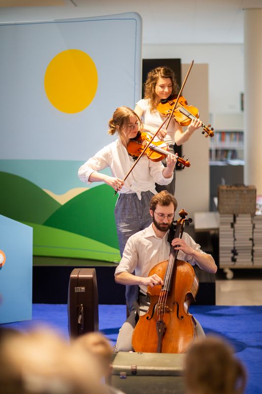 De klanken van de viool, altviool en de warme cello laten je dromen van het strand in Spanje, de fjorden in Noorwegen, de Roemeense ritmes of de Italiaanse gastvrijheid. De muzikanten spelen en dansen samen met de kinderen. Heerlijk dichtbij op het grote kleed, terwijl ze als kleine muzikantjes mee kunnen spelen met muzikaal speelgoed.